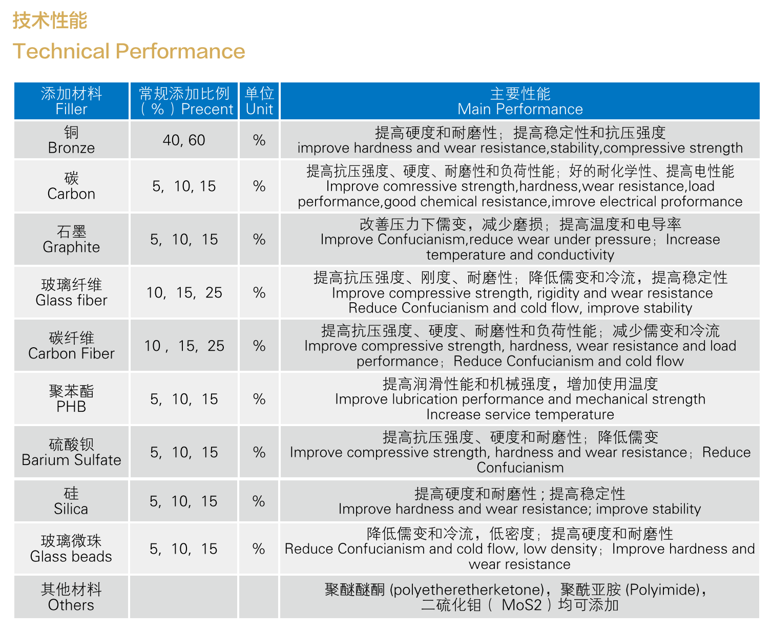 特征:填充聚四氟乙烯又叫增强聚四氟乙烯,是用聚四氟乙烯添加一定量填充剂,如玻璃纤维,玻璃微珠、二氧化硅、硫酸钡、青铜粉,二硫化钼,石墨,碳纤维等,经高速混合均匀后模塑成型烧结而成。提高 PTFE 的压缩、回弹性,减小冷流性等。